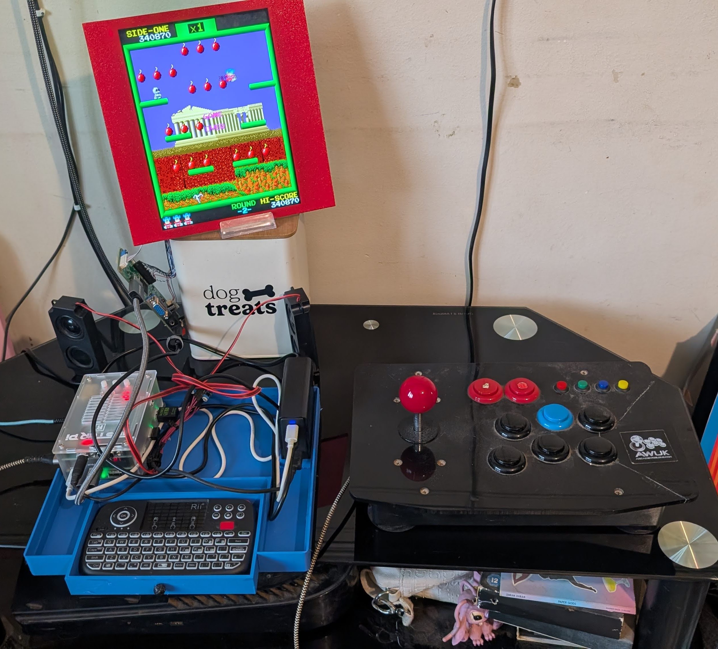 The main guts sit in the base and are secured. The display controller and audio amp will be affixed to the rear of the cabinet in upcoming builds. The draw holding the keyboard does pull out so the keyboard is stored when not in use and available when needed. The screen is rotatable and seen here in a vertical orientation for Bomb Jack.