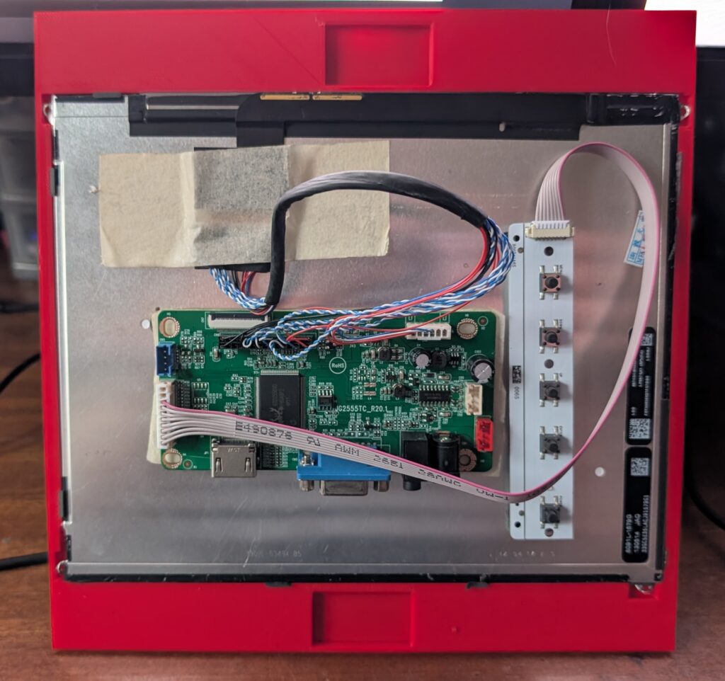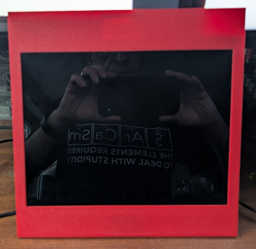 I now have a new bezel printed for my desktop arcade project. Here are two photos showing front and back. Front shows my reflection taking the photo (unavoidable) and the back shows gaps that will hold the magnets that will keep the bezel in place in the case surround. It’s designed to be square so rotatable to match game orientation. The screen is an iPad 3 screen connected to an HDMI/VGA display controller, both obtained from Ali Express.